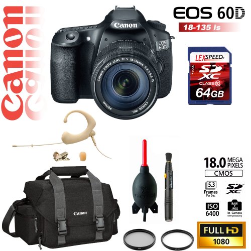 Canon EOS 60D 18 MP CMOS Digital SLR Camera with Canon EF-S 18-135mm IS Lens + Que Audio Talent + Canon 300DG Bag + Filters + 64GB (10) The Canon EOS 60D 18 MP CMOS Digital SLR Camera with Canon EF-S 18-135mm IS Lens (4460B004) with the Que Audio Talent, Canon 300DG Bag, Filters and 64GB SD (10) Memory Card.
