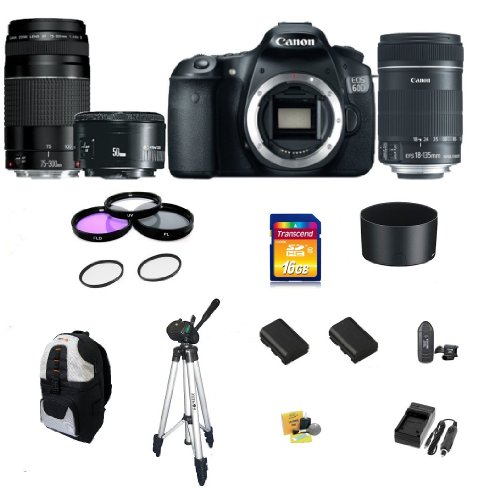 Canon EOS 60D DSLR Camera with 3 Canon Lens Pro Pack: Includes - Canon EF-S 18-135mm f/3.5-5.6 IS Lens - Canon Zoom Telephoto EF 75-300mm III - Canon EF 50mm f1.8 II Autofocus Lens, Also Includes Deleuxe Backpack, 2 Extra Batteries & Travel Charger, 16GB SDHC Card & Card Reader, 3 Piece Pro Filter Kit with 2 Extra UV Filters and much more... An EOS with Perspective.