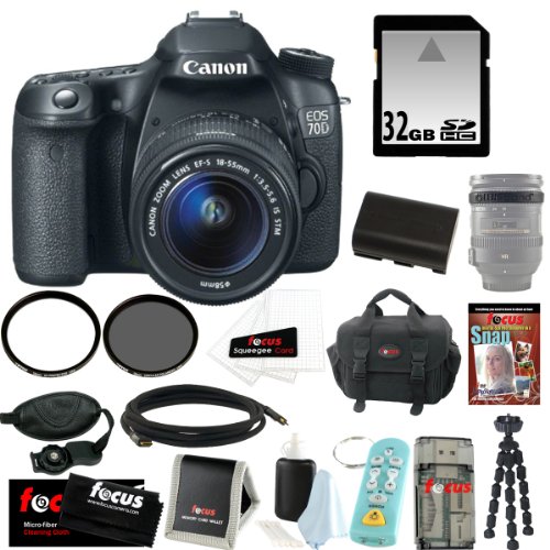 Canon EOS 70D SLR CMOS 20.2MP Digital Camera EFS 18-55mm Lens + 32GB Memory Card + Tiffen 58mm UV Protector + Universal Memory Card Reader + Kit 20.2MP APS-C CMOS Sensor Dual Pixel CMOS AF with Live View 3.0 1,040k-Dot Vari-Angle Touchscreen Full HD 1080p Video with Move Servo AF Built-In Wireless Connectivity