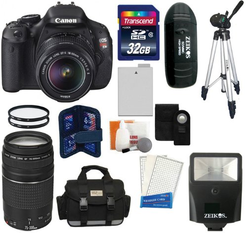 Canon EOS Rebel T3i Digital Camera SLR Kit With Canon EF-S 18-55mm IS II + Canon EF 75-300mm III Autofocus Lens + 32GB Card + Battery + 2 Filters + Tripod + Accessory Kit The Canon 5169B003 includes the EOS Rebel T3i Digital SLR Camera and EF-S 18-55mm f/3.5-5.6 IS type II Lens. This camera and lens will help photographers who are looking for an easy-to-use camera to create their next masterpiece. The next in a long line of phenomenal compact DSLRs, the EOS Rebel T3i continues the Rebel tradition of easy operation, compact design and no-compromise performance. Featuring Canon's newest DIGIC 4 Image Processor and an 18.0 Megapixel CMOS Image Sensor plus cutting-edge technologies like Full HD video recording, Live View shooting, Wireless flash photography and even a Vari-angle 3.0-inch LCD monitor, the EOS Rebel T3i offers the best of EOS photography in a compact package.What's in the box: Canon EOS Rebel T3i Digital Camera Kit, EF-S 18-55mm f/3.5-5.6 IS II Autofocus Lens, Eyecup Ef for Digital Rebel Cameras, LP-E8 Rechargeable Lithium-Ion Battery Pack (7.2V, 1120mAh), LC-E8E Battery Charger, Wide Strap, USB Interface Cable IFC-130U, AVC DC400ST Stereo AV Cable, EOS Digital Solution Disk, Software Instruction Manual CD-ROM, Camera Instruction Manual and 1-Year Limited Warranty.