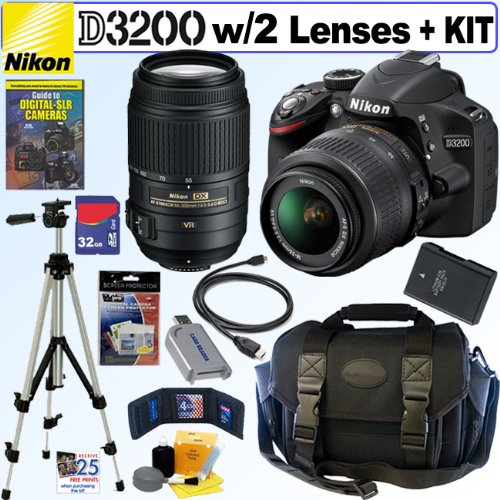 Nikon D3200 24.2 MP CMOS Digital SLR Camera with 18-55mm f/3.5-5.6G AF-S DX VR and 55-300mm f/4.5-5.6G ED VR AF-S DX NIKKOR Zoom Lenses + EN-EL14 Battery + 32GB Deluxe Accessory Kit A new level of image quality, a familiar way of sharing. Nikon D3200 HD-SLR camera: Don't let the D3200's compact size and price fool you-packed inside this easy to use HD-SLR is serious Nikon power: a 24.2 MP DX-format CMOS sensor that excels in any light, EXPEED 3 image-processing for fast operation and creative in-camera effects, Full HD (1080p) movie recording, in-camera tutorials and much more. What does this mean for you? Simply stunning photos and videos in any setting. And now, with Nikon's optional Wireless Mobile Adapter, you can share those masterpieces instantly with your Smartphone or tablet!