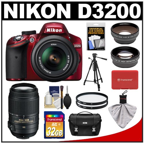 If you are interested in purchasing Nikon D3200 Digital SLR Camera & 18-55mm G VR DX AF-S Zoom Lens (Red) + 55-300mm VR Lens + 32GB Card + Case + Filters + Tripod + Telephoto & Wide-Angle Lens Kit, please check price first, may be today you get discount for this product from Amazon.com